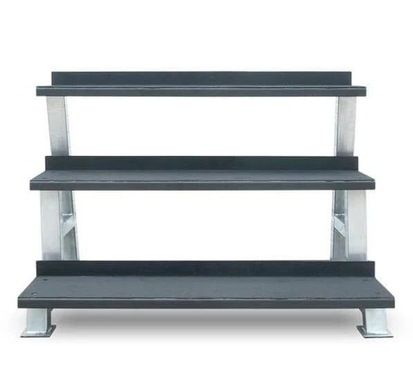 The Morgan 3-Tier Kettlebell Rack is a commercial-grade storage system recommended for gyms and serious trainers with home gyms. The rack is constructed in heavy-duty steel and has a low, middle, and high racking system ~ a spacious 3-tier design. This rack can accommodate a complete set of kettlebells with room to spare. This kettlebell rack is extremely strong enough to hold the heaviest kettlebells with commercial strength and home gym price carry over. Includes rubber liners for noise-reduction. This storage system can also hold slam balls and dumbbells.ย