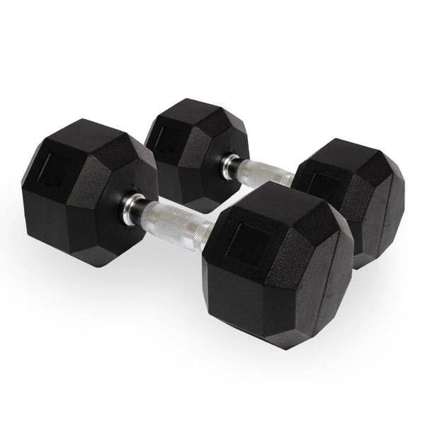 Our rubber-encased hex dumbbell is manufactured using a solid construction with heavy-duty structural integrity and is designed to fit snuggly in your hand. Our rubber hex dumbbells are built to last.