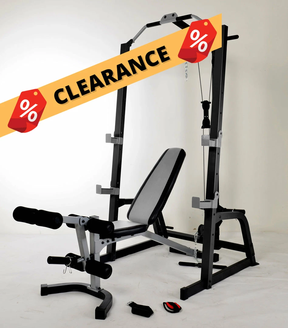 This professional combination free-weight gym system includes a lat pull down system with low row, multi positioning bar rests that be used with the FID bench or without when doing squats.