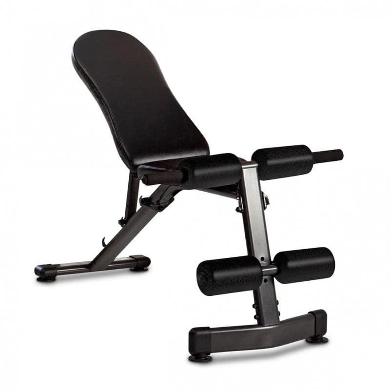 The bench features a sturdy frame constructed from powder-coated steel and comfortable high density deluxe boxed upholstery that firmly supports your body. An adjustable back pad allows flat, incline, decline, and military style presses. Padded rollers provide a comfortable perch for legs to support proper form during leg exercises.