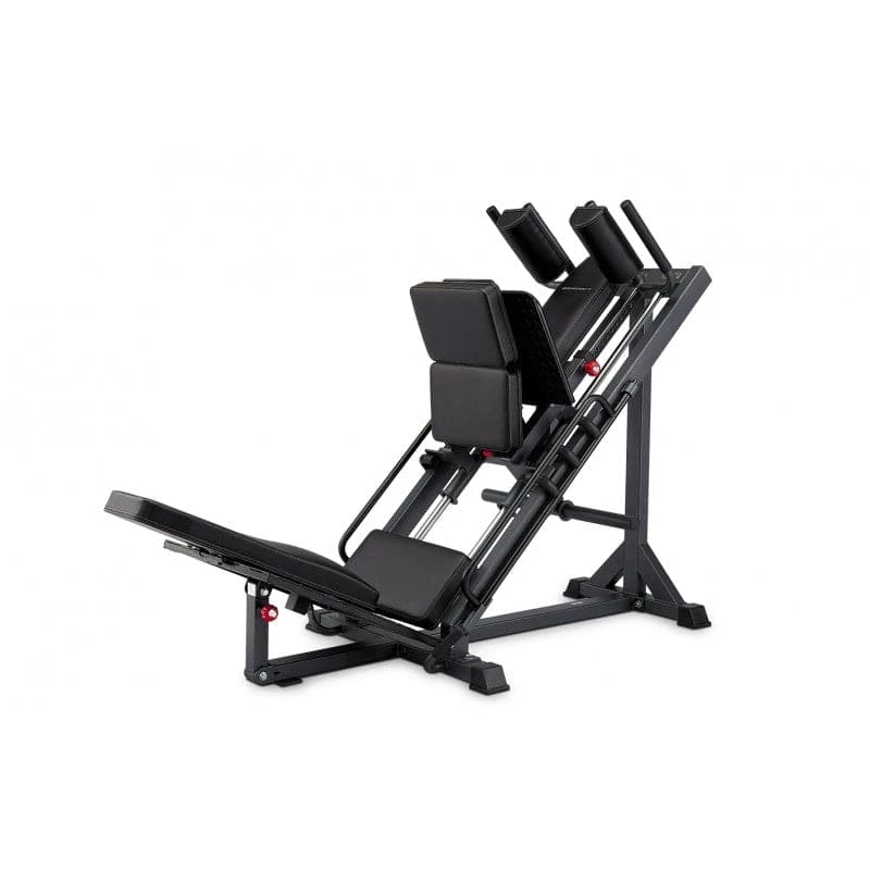 Adjustable pads to quickly adjust from leg press to hack squats exercise.